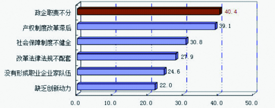 二是政府职能转变不到位,包括“承担了过多的社会责任”(34.2%)和“政府干预较多”(32.5%)。