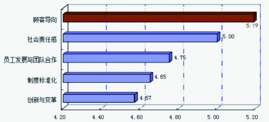' 调查结果显示,以6分制计算,企业家对自己所在企业文化建设五个方面的评分依次是:顾客导向(5.19)、社会责任感(5.00)、员工发展与团队合作(4.75)、制度标准化(4.65)和创新与变革(4.57),均明显高于中值3.5。调查表明,企业家对本企业的企业文化的五个方面均持比较乐观的态度,其中,顾客导向的得分最高,表明大多数企业家对顾客更加重视。