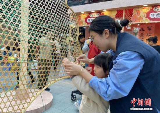 现场特设互动区,活动方邀请游客共同参与创作,体验“非遗之韵”。1994年出生的竹编新生代传承人肖瑶正教游客如何编织。