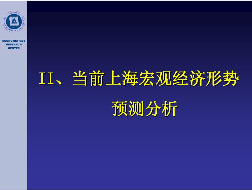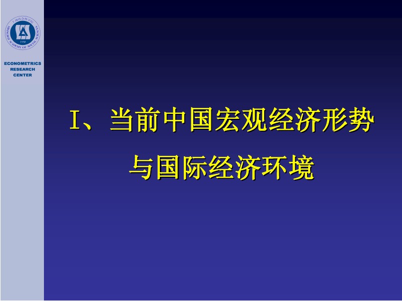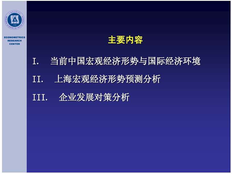 我今天讲的题目主要是三个内容,一个是当前中国宏观经济形势与国际经济环境。第二上海宏观经济形势预测分析。第三企业发展对策分析。