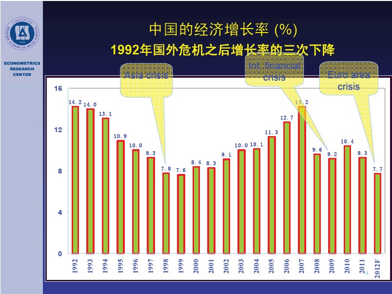 第一,中国经济增长的情况,大家可以看到这张PPT,92年开始,当中来看有几次危机,一次是亚洲金融危机,我们的经济增长从92年14.2%,慢慢下来98年是7.8%,99年7.6%,经过2000年慢慢好转,2003年到两位数,经济不断上涨,我们的股市是从05年底好起来,临点是07年,08、09年经济危机。今年预计7.7%左右,这是全国的情况。