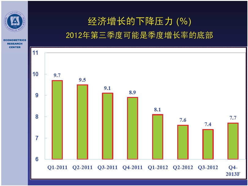 从整个经济趋势来看,经济增长下降压力从图表可以看到,它是一路下滑,今年第三季度是最低,7.4%,预计全年是7.7%左右,保8%是基本难以实现的。