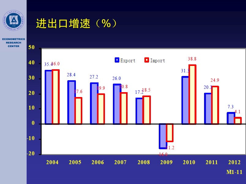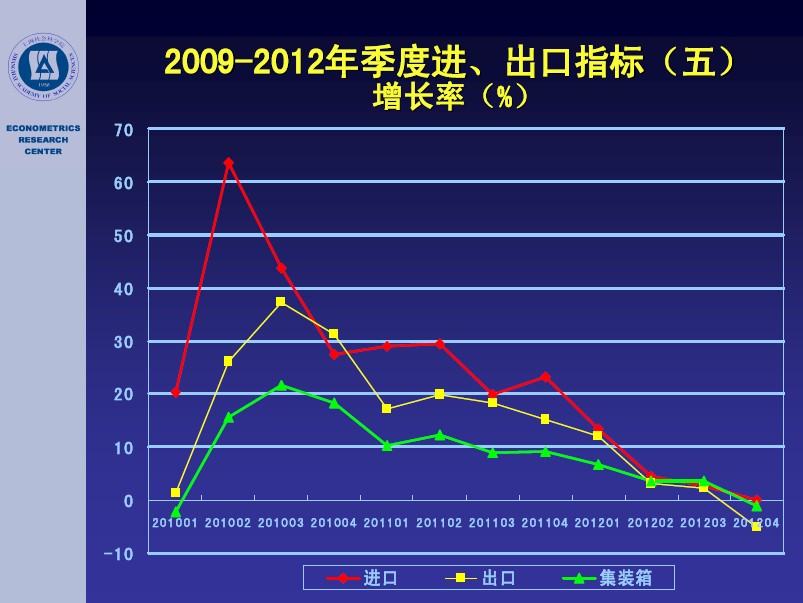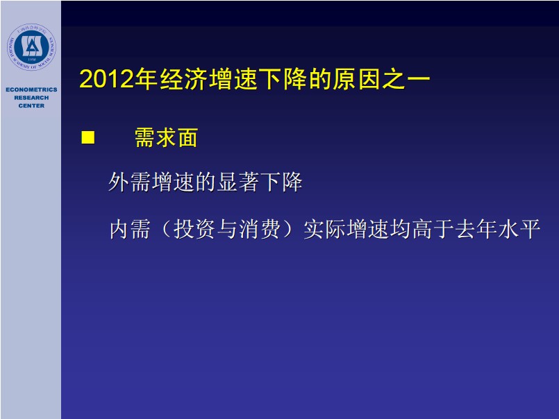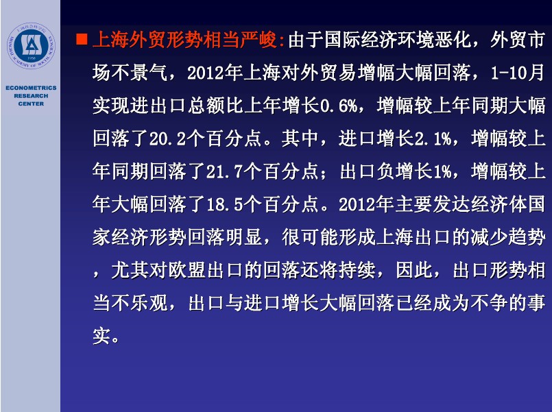关于经济增长下降的原因,主要从两个方面来看,需求方面来看,主要是外需的增速显著下降,外贸这一块情况是非常差。内需这一块,实际的增速比去年的水平不低,基本上是持平,我们可以看一些数据,我们的进出口从04年到2012年11月份,我们可以看到,在这个当中,09年因为是美国的次贷危机造成了国际金融危机,外贸是负增长。2010年反弹很快,2011年也比较快,但是2012年就比较差,外需的压力,对上海外向型经济依赖度比较强的城市压力比较大。