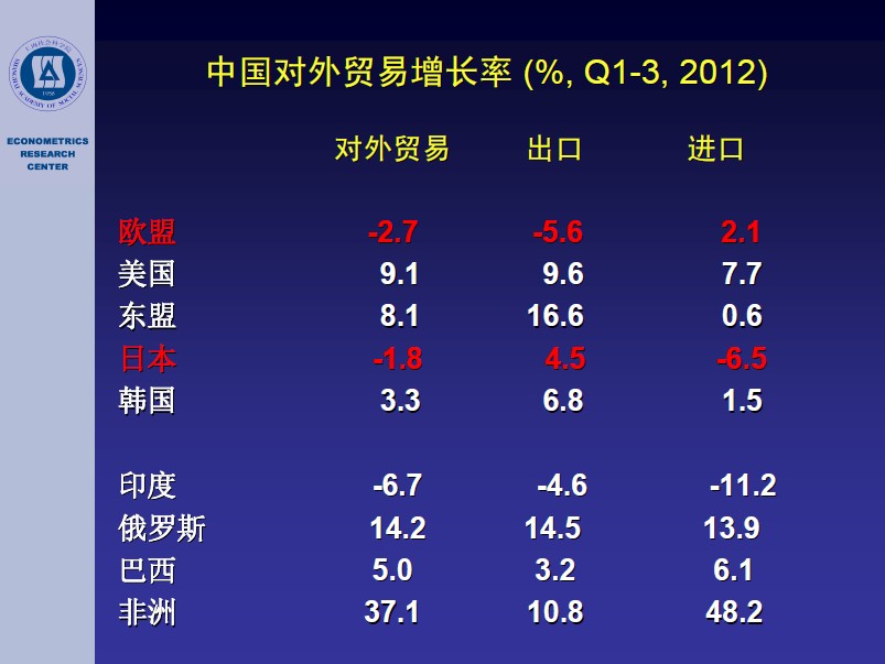 我们来看外贸增长率,欧盟是负的,从今年一到三季度,主要是在-2.7%,出口-5.6,进口2.1,美国要好一些,东盟保持的水平也是有所下降,日本各种各样的原因也是大幅度下降,跟印度、俄罗斯、巴西,总体还是呈下降的趋势,俄罗斯好一些。