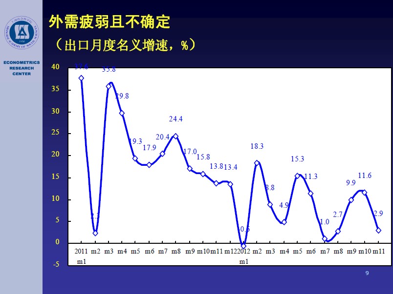 外需月度名义增速是明显的下降趋势,外需对我们经济影响非常大,明年能不能起来,这是非常不确定的。