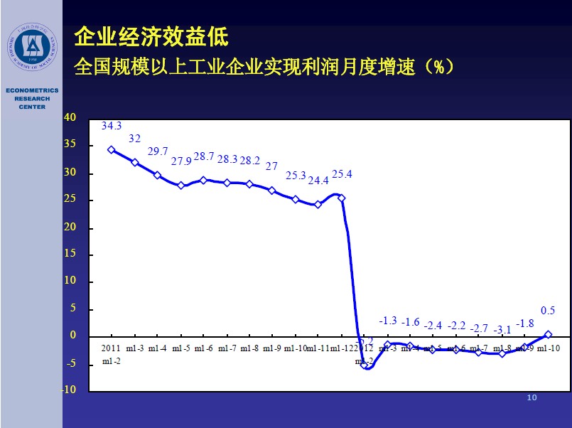 企业的经济效益,全国规模以上工业企业实现利润月度增速,去年维持在比较高的水平,从今年开始下降,10月份刚刚开始上升,所以这个态势非常不好。