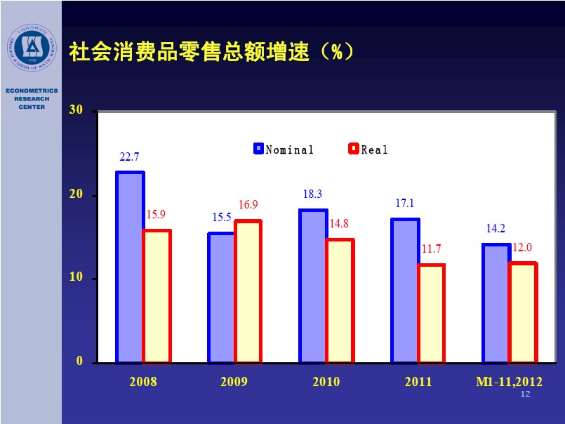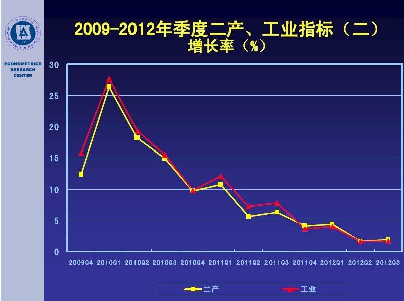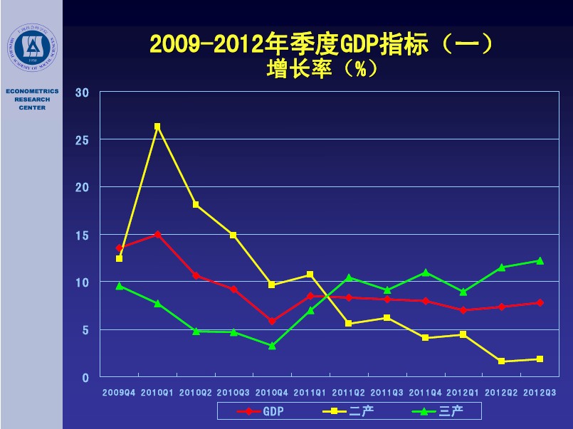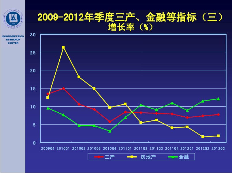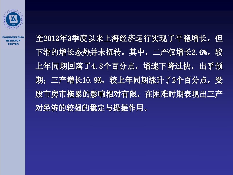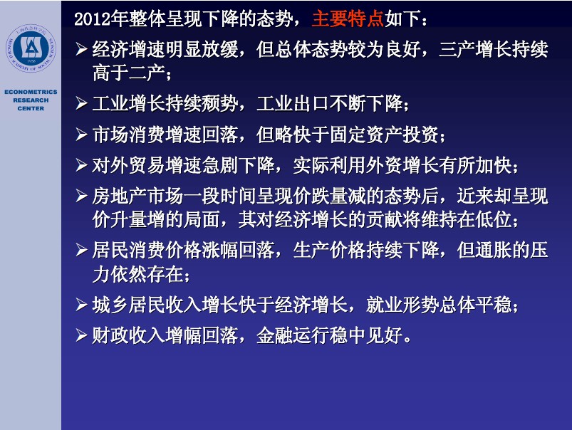 2012年总体经济是呈现下降的态势,经济增速明显放缓,总体态势较为良好,三产的增长持续高于二产,为什么?2012年经济增长是开头第一季度7%,之后是7.4%,7.4%,到第四季度有可能会到7.8%,我们是第一季度最低,这个态势比全国好,但是总的增长还是比较低,三产起到很大的作用,我们也在考虑,为什么每一次金融危机或者是危机出现的时候都是二产很低,三产高起来,到了一段时间,4万亿投资下去,二产上去,三产下去,对统计的数据,我们有时候会有点迷惑。工业增长持续颓势,工业出口不断下降。市场消费增速回落,但略快于固定资产投资。对外贸增速急剧下降,实际利用外资增长有所加快。房地产市场无一段时间呈现价跌量减的态势后,近来却呈现价升量增的局面,其对经济增长的贡献将维持在低位。居民消费价格涨幅回落,生产价格持续下降,但通胀的压力依然存在。城乡居民收入增长快于经济增长,就业形势总体平稳。财政收入增幅回落,金融运行稳中见好,但是股市不好,今年会好到什么程度,还要看经济,还要看经济形势。