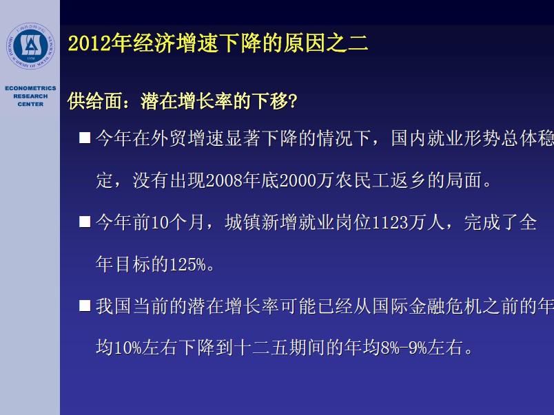 供给面,我们的想法是不是潜在的增长率是下移的?今年外贸增速显著下降的情况下,国内就业形势总体稳定,没有出现08年底2千万农民工返乡的情况下,我们在社科院跟高校有联系,对于用工需求不是太大,生产的订单没有那么多,这是我们注意到的。今年前10个月,城镇新增就业岗位1123万人,完成了全国目标的125%。我国当前的潜在增长率可能已经从国际金融危机之前的年均10%左右下降到“十二五”期间的年均8%-9%左右。