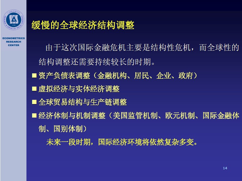 全球经济进行经济结构的调整,这次的危机主要是结构性危机,而全球性的结构调整还需要持续较长的时期,涉及到资产负债表调整,金融机构、居民、企业、政府,欧洲无限量购买国债,可能会降低债务比较重的国家融资成本,但是对于欧洲整体来讲,减缓短期的压力,但是长期体现在资产负债表上,这样造成不利的影响。另外是虚拟经济与实体经济的调整,美国次贷危机,美国造成的金融危机主要是美国的实体经济,实际上是到了原来的81%,到发生次贷危机的时候只有42%,这样的一个实体经济的比例缩小,虚拟经济规模扩张的话,这样的情况下爆发了金融危机,实体跟虚拟必须是要适度的,实体是创造实实在在的利润,虚拟是创造虚拟的利润,虚拟的利润挤占实体的利润肯定会出现问题。还有关于全球贸易结构与生产链的调整等等一系列的问题摆在我们的面前。