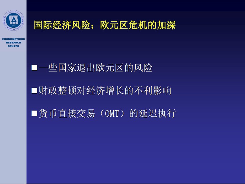 国际经济风险,欧元区危机的加深,一些国家退出欧元区的风险,欧盟是货币统一财政不统一,这里是有很大的问题要解决。另外是货币直接交易(OMT)的延迟执行,这里面都会有一些问题。这些都会成为2013年经济冲击,1月份刚刚开始,有一些企稳,欧洲今年会好一点,但是当中还会有各种各样的波折,这是需要在今年经济运行当中去关注的。