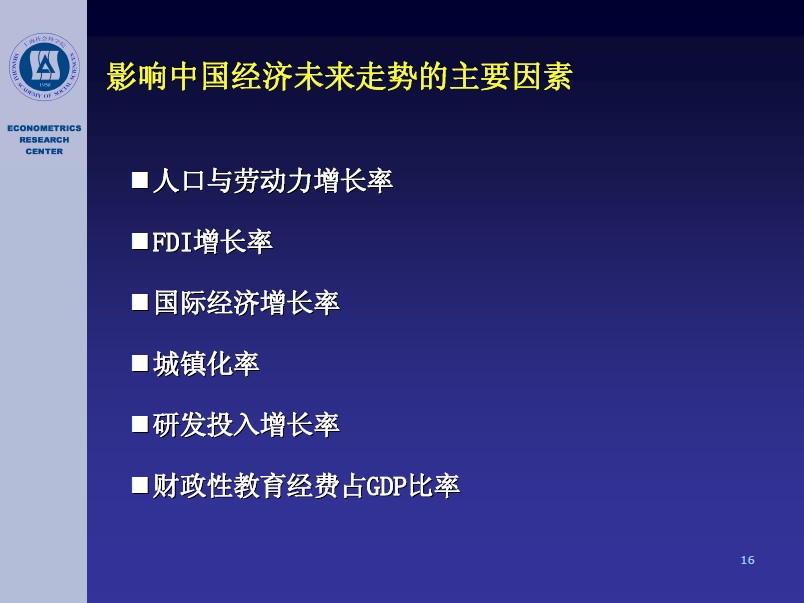 影响中国经济未来的走势的主要因素,人口与劳动力的增长率,因为人口红利基本消失,劳动力的成本越来越高,这是企业家都面临的问题,这一块要注意。另外是FDI增长率,从全国来讲,它是受到一定的影响,上海今年还好,FDI实际还在增长。国际经济增长率,2013年欧洲企稳,美国上升。新兴城镇化是我们经济增长的一个新的动力,那么到底如何理解新兴城镇化能带来多少动力,这还需要大家去琢磨,可能有一些机会。另外就是研发投入增长,创新是一个风险,去创新有可能会找死,不创新就是等死,所以这是矛盾的问题,关键如何把握。还有就是财政性教育经费占GDP比率,上海4%,每年700亿,但是这里有很多的问题,教育经费乱用,并没有很好的提高学生的素质或者是学生教育明显的提升,在量化指标有提升,但是实际并不一定能看到,这是体制下的问题,我们的这个体制,我们的经济发展到现在,是体制上已经充分用了,下一步如何怎么去走,是我们一直在考虑的问题,因为到底怎么走,如果还是在现在的机制下,78年以来这样的机制下继续走,这个路怎么走,这都是人们在考虑的问题,我们在担忧的问题。