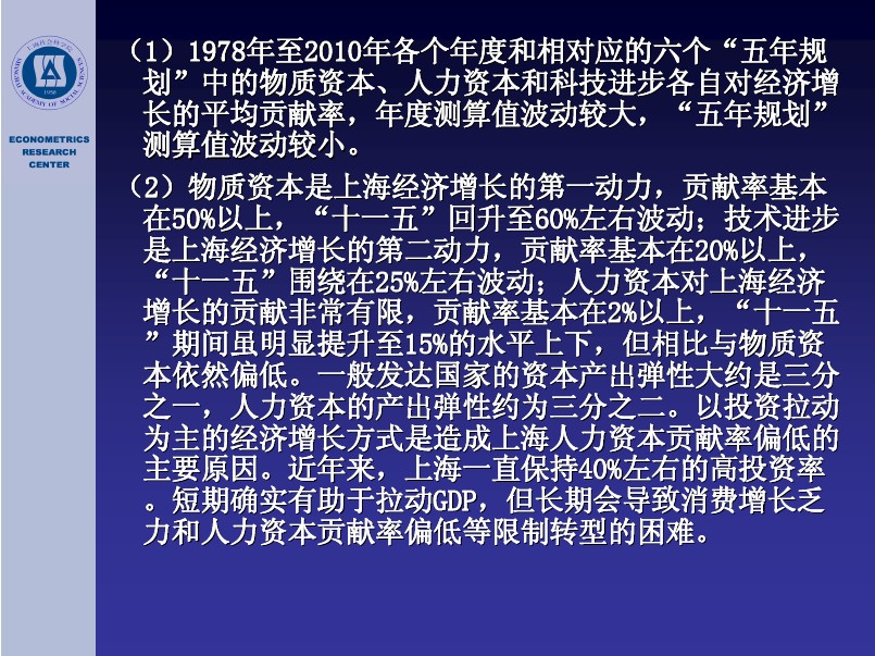 第二物质资本是上海经济增长第一动力,贡献率基本在50%以上。十一五回升至60%左右波动。技术进步是上海经济增长的第二动力,贡献率基本在20%以上。十一五围绕在25% 左右波动,人力资本对上海经济增长的贡献非常有限,贡献率基本在2%以上,十一五期间虽然明显提升至15%的水平上下,但相比与物质资本依然偏低。一般发达国家的资本产出弹性大约是三分之一,人力资本的产出弹性约为三分之二。以投资拉动为主的经济增长方式是造成上海人力资本贡献率偏低的主要原因。近年来,上海一直保持40%左右的高投资率。短期确实有助于拉动GDP,但长期会导致消费增长乏力和人力资本贡献率偏低等限制转型的困难。