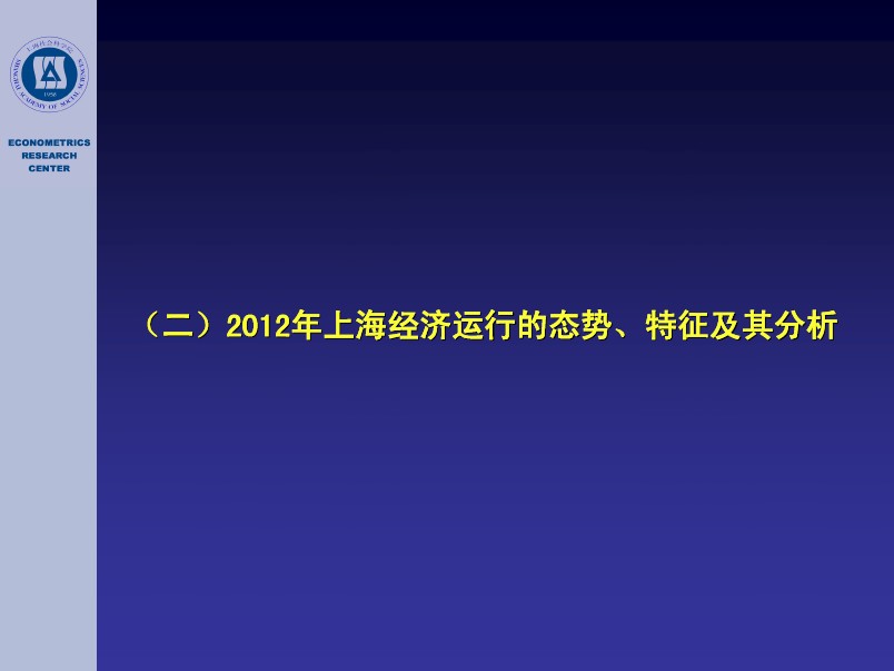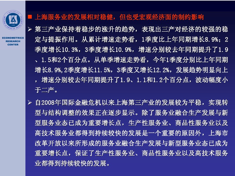 非常感谢主办单位,尤其感谢上海市商务诚信建设试点领导小组办公室和上海企业竞争力研究中心,有这个机会,把我们做的一些研究,对于宏观经济,尤其是上海经济形势分析判断,趁这个机会做介绍。