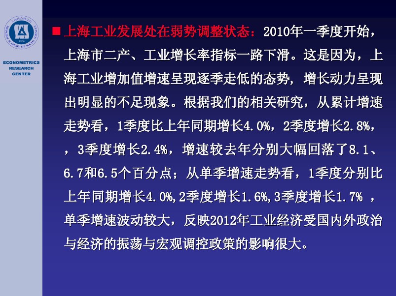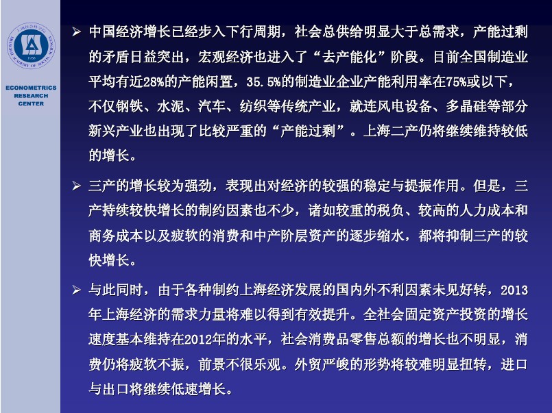 2013年经济形势预测分析,中国经济增长已经不如下行周期,社会总供给明显大于总需求,产能过剩的矛盾日益突出,宏观经济也进入了去产能化阶段,目前全国制造业平均有近28%的产能闲置,35.5%的制造业企业产能利用率在75%或者以下,不仅钢铁、水泥、汽车、纺织等传统产业,就联风电设备、多晶硅等部分新兴产业也出现了比较严重的产能过剩,上海二产仍将继续维持较低的增长。