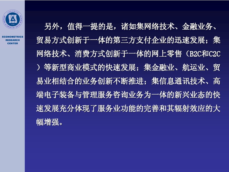 另外,值得一提的是,网络技术、金融业务、贸易方式创新于一体的第三方支付企业的迅速发展,集网络技术、消费方式创新于一体的网上零售等新型商业模式的快速发展,集金融业、航运业、贸易业相结合的业务创新不断推进,集信息通讯技术、高端电子装备与管理服务咨询业为一体的新兴业态的快速发展充分体现了服务业功能的完善和其辐射效应的大幅度增强。