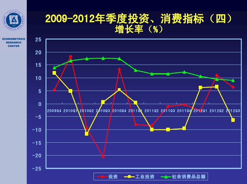 投资消费这一块可以看到,总体来说投资是总体下降趋势,投资的波动比较大,社会消费品零售总额增长还是比较平稳,但是下降趋势很明显,工业投资也在下降。投资有所增长,动力相对不足,这是一个方面,因为到现在为止,11月份上海投资增长是4%,消费支出后进不足,商品销售总额较上年增长19.3%,社会消费品零售总额增长9.1%,增幅较上年同期有所回落。