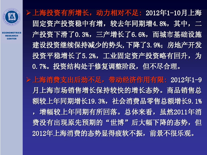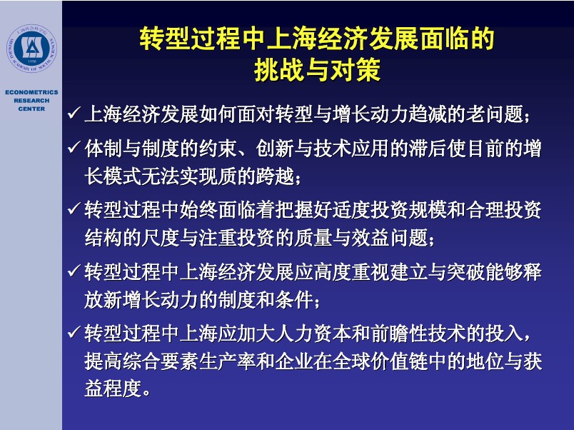 转型过程中上海经济发展面临的挑战与对策。上海经济发展如何面对转型与增长动力趋减的老问题。体制与制度的约束、创新与技术应用的滞后使用目前增长模式无法实现质的跨越。转型过程中始终面临着把握好适度投资规模和合理投资结构的尺度与注重投资的质量与效益问题。转型过程中上海经济发展应高度重视建立与突破能够释放新增长动力的制度和条件。转型过程中上海应加大人力资本和前瞻性技术的投入,提高综合要素生产率和企业在全球价值链中的地位与获益程度。我们的企业在全球价值链当中处于低端,所以我们在这个分配无当中根本拿不到利润,我们从一个iPad就知道,我们可以拿到很少,如果不改变这样一种局面,我们的经济增长是很难能够看到。