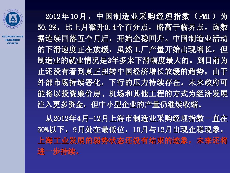 从PMI指标订单指数来看,很长时间都是从2011年4月份开始,基本上都是在50%以下,现在是在下滑,来看一些数据,全国来讲PMI50.2%,回升了,但是总体来讲,制造业下滑的速度正在放缓,下换的速度是这三年最大的,目前还没有看到扭转的趋势。2012年上海市制造业采购经理指数一直在50%以下,9月处于最低位,10月与12月出现企稳现象。