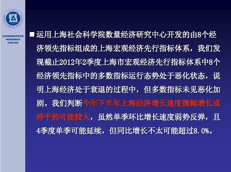 我们做了一个上海经济领先指标合成指数,滞后2个月,可以判断这个指标里面,从最早07年开始下滑、上升然后又是下滑,基本处于企稳态势,经济增长不可能有什么大幅度的变化。