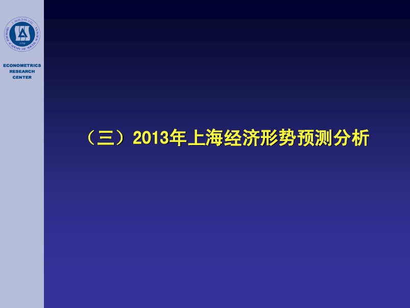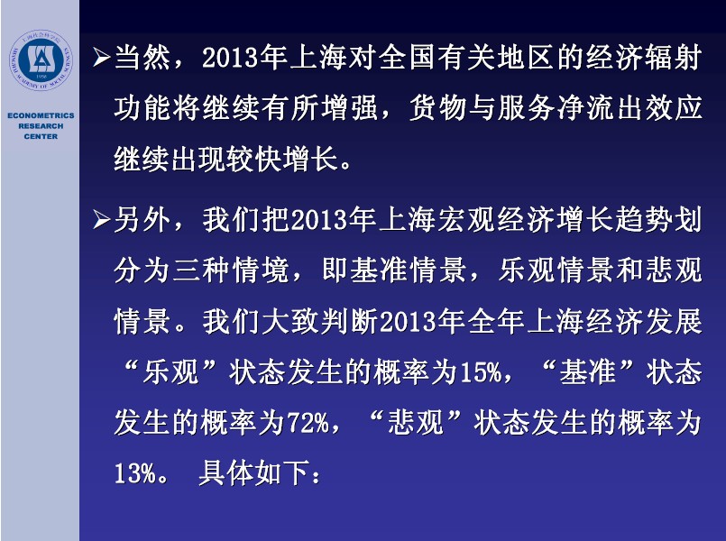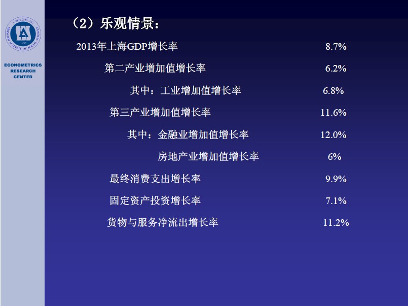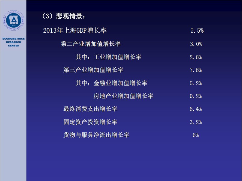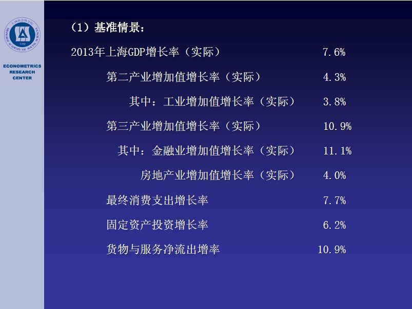 基准情景,2013年上海GDP增长7.6%,二产4.3%,工业增加值增长3.8%,三产10.9%,金融业11.1%,房地产4%,最终消费支出7.7%,固定资产投资6.2%,货物与服务净流出增率10.9%。这样的话,基准情况下,我们可以比较高的概率来预测7.6%的水平。
