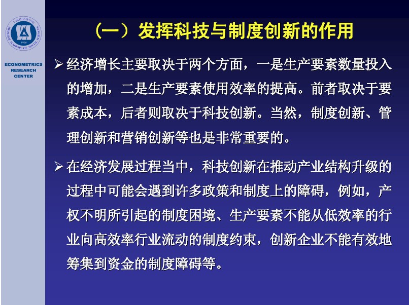 发挥科技与制度创新的作用,经济增长主要取决于两个方面,一个是生产要素数量投入的增加。第二是生产要素使用效率的提高,前者取决于要素的成本,后者则取决于科技创新。当然,制度创新、管理创新和营销创新等也是非常重要的。