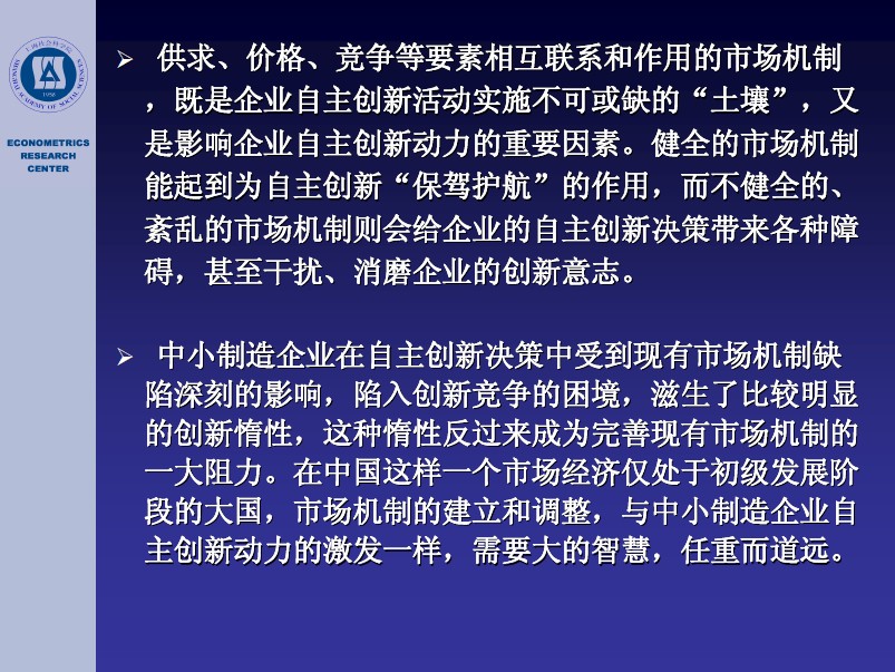 中小制造企业在自主创新决策中受到现有市场的机制缺陷深刻的影响,陷入创新竞争的困境,滋生了比较明显的创新惰性,这种惰性反过来成为了完善现有市场机制的一大阻力。在中国这样一个市场经济仅处于初级发展阶段的大国,市场机制的建立和调整,与中小制造企业自主创新动力的激发一样,需要大的智慧,任重而道远。