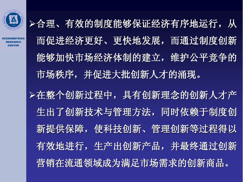 合理、有效的制度能够保证经济有序地运行,从而促进经济更好、更快的发展,而通过制度创新能够加快市场经济体制的建立,维护公平竞争的市场秩序,并促进大批创新人才的涌现。