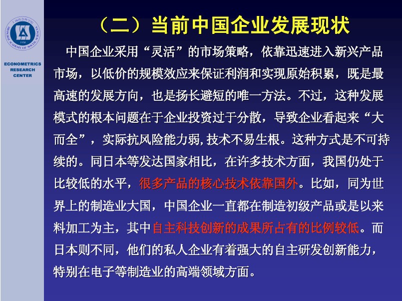 在经济发展过程当中,科技创新在推动产业结构升级的过程中可能会遇到许多政策和制度上的障碍。例如,产权不明所引起的制度困境,生产要素不能从低效率的行业向高效率行业流动的制度约束,创新企业不能有效地筹集到资金的制度障碍等。如果把所有的资源集中在央企、大企业,那么这个可能会导致资源配置不合理,导致抵销,央企、国企的低效率都是我们公认的,如何提升央企国企的效率,这是一个方面的问题。另外发展中小企业民营企业,这是关键,如果这个不发展,我们的经济是很危险。