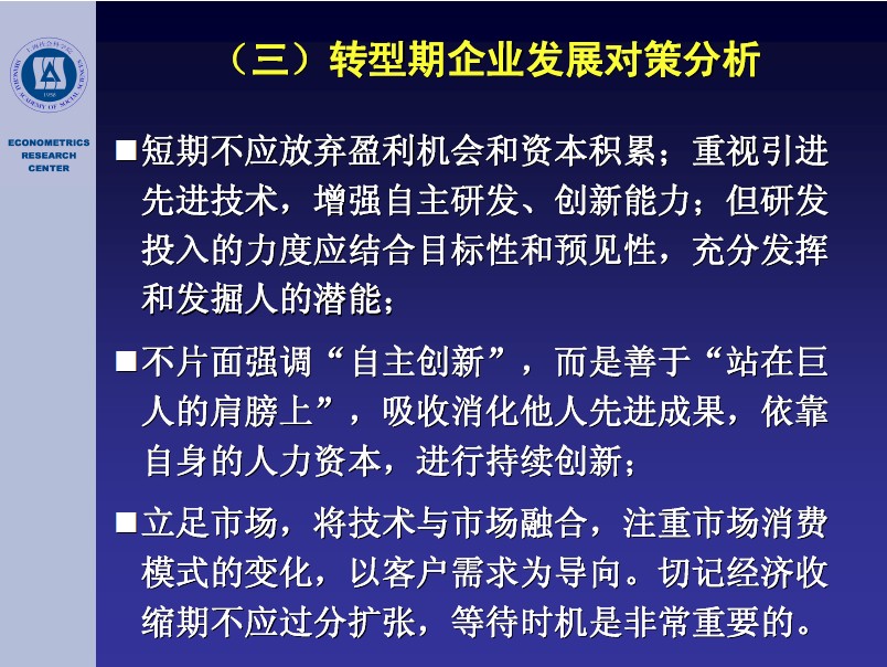 转型期间企业发展对策里面,短期对每个企业不要放弃盈利的机会和资本积累,重视引进先进技术,增强自主研发、创新能力,但研发的投入的力度应该结合目标性和预见性,充分发挥和发掘人的潜能。不是投入研发越多越好,有的时候不投入研发也会使企业很好的发展,干间怎么做。我们讲一个企业研发多了,必须有目标性和预见性,如果滥用或者是为了达到某种目的大量投入研发这是没用的,是浪费。
