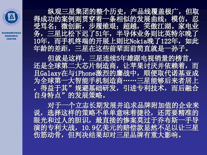 立足市场,将技术与市场融合,注重市场消费模式的变化,以客户需求为导向,切忌经济收缩期不应过分扩张,等待时机是非常的重要。我们来看三星集团的历史,三星集团产品是覆盖非常广,但是取得成功的案例贯穿于一条相似的发展曲线,模仿、忍受辱骂,微创新,步履维艰,笑傲江湖。家电业务,三星比松下迟了51年,半导体业务则比英特尔晚了10年,而手机终端的开展上则比诺基亚晚了122年,比如年龄的差距三星在这些前辈面前简直就是一个孙子。就是这样,三星连续5年雄踞电视销量的榜首,还是全球第二大芯片制造商,让苹果讨厌并依赖,而Galaxy在与iphone激烈的竞争中,顺便取代诺基亚成为全球第一大智能手机制造商。对于一个立志长期发展并追求品牌附加值的企业来说,选择这样的策略不单单意味着结晶,还需要精准的眼光和过人的胆识,最直接的惨案莫过于乔布斯一手导演的专利大战。