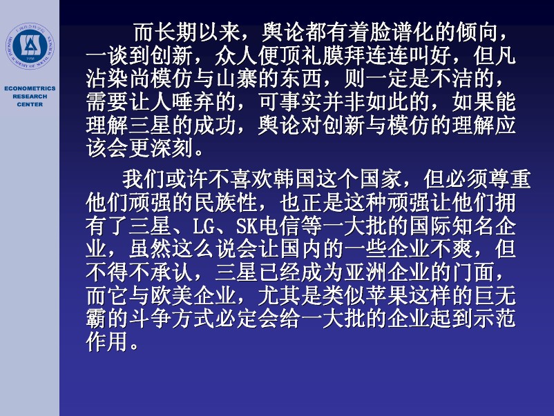 而长期以来,舆论都有着脸谱化的倾向,一谈到创新,众人便顶礼膜拜连连叫好,但凡沾染尚模仿与我山寨的东西,则一定是不洁的,需要让人唾弃的,可事实并非如此,如果能理解三星的成功,舆论对创新与模仿的理解应该会更深刻。