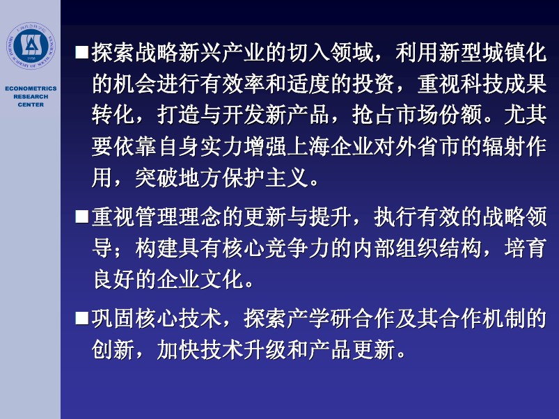 在经济箫条的时候,探索亿战略新兴产业的切入领域,利用新型城镇化的机会进行有效率和适度的投资,重视科技成果的转化,打造与开发新产品,抢占市场份额,尤其要依靠自身实力增强上海企业对外省市的辐射作用,突破地方保护主义。每个地方都会保护自己的企业,我们怎么样从上海到周边或者更远的地方把我们的产' 品打出来,这是需要实力,如果没有实力肯定是被人唾骂的。有一年我跑到内蒙古,买东西的时候说,你这个东西怎么样,他说你放心买,我们做东西实实在在,不像浙江一些企业,我一想确实浙江把产品卖到很多地方,但是他们的产品是没有质量的,如果通过欺骗赚别人的钱,你的声誉就没有了,你的生命就没有了。实力如何打造?在现在这样的时段,在经济不太景气的时候,正好给我们一个转型提升自己实力的机会,虽然不需要扩张规模,但是可以提升我们的实力,等到经济繁荣的时候你的力量就会释放出来,企业取得成功,这样上海整个经济实力得到提升及
