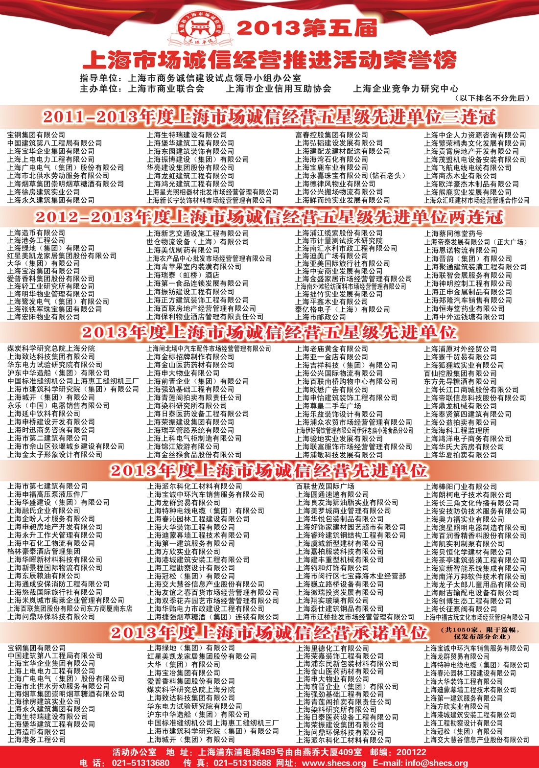 2013第五届上海市场诚信经营推进活动荣誉榜