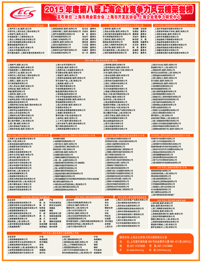 2015年上海企业的竞争力总体水平如何?上海企业竞争力研究中心联合上海市商业联合会、上海市开发区协会、同济大学经济与管理学院等单位,共同开展2015年度上海企业竞争力课题研究已于近日完成,同期发布2015年度第八届上海企业竞争力风云榜榜单。