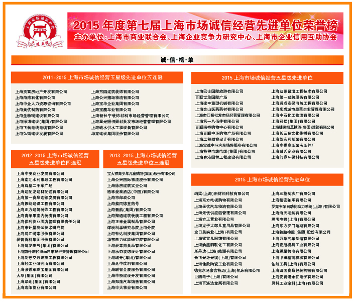 2015年度上海市场诚信经营先进单位获奖名单