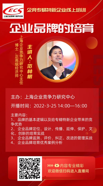 在当前疫情情况下,为了更好服务广大专精特新企业,作为服务国家级专精特新“小巨人”企业服务机构,上海企业竞争力研究中心开通“企竞专精特新企业线上培训平台”,针对广大中小企业、专精特新企业,围绕品牌培育、知识产权应用和保护、科研成果转化、财务管理与融资、信用管理等专题开展线上培训。