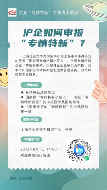 主要内容 专精特新政策概念 国家级“专精特新小巨人”、市级“专精特新企业”的申报要求及限制条件 上海市各区的“专精特新”企业奖励政策一览 主讲教师 上海企业竞争力研究中心张英