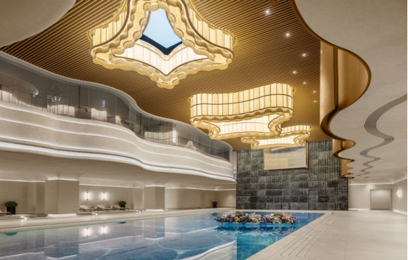 在功能布局上,“源CLUB”融合了社交、休闲与运动等多重场景。25米长、11米宽的恒温泳池,通过10米挑空与自然和智能的天窗设计,实现自然光线和模拟光照的有机互动;运动区域则借助下沉庭院与自然采光,打造出花园式的健身体验。此外,会所还配备茶室、红酒雪茄吧、咖啡厅、多功能厅、私宴厅、SPA疗愈区等多元空间。